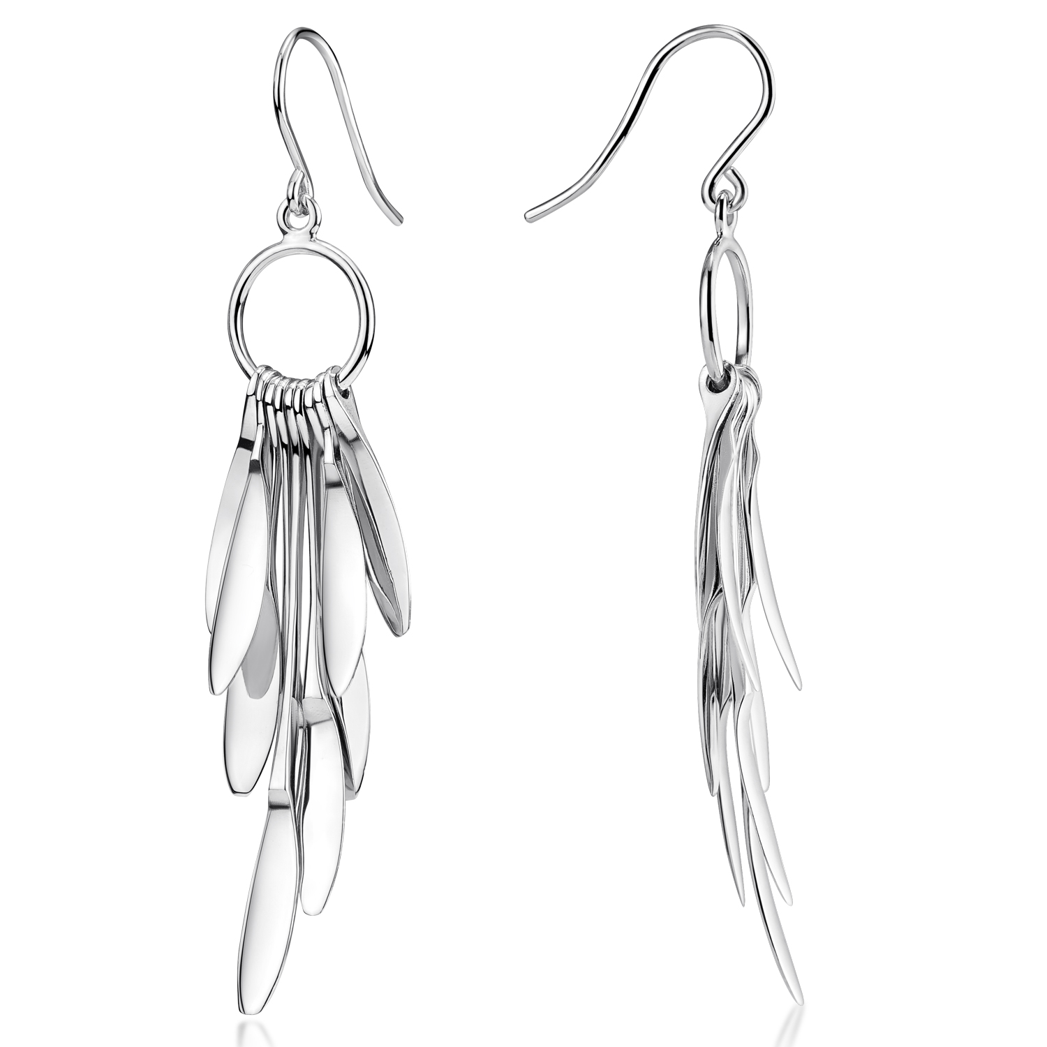 Die Spitzen der Tropfen Elemente sind leicht in eine gemeinsame Richtung gebogen und erzeugen dadurch eine einzigartige Optik. Die Tropfenohrringe sind rhodiniert und damit dauerhaft anlaufgeschützt. Dies stellt sicher, dass sich die Besitzerin Ihrer Ohrringe lange erfreut. Die Rückseite der Pendel Ohrringe wurde ebenfalls kompakt gearbeitet und ist nicht hohl. Alle Tropfen-Pendel sind freischwingend und weisen eine wertige, dicke Materialstärke auf.