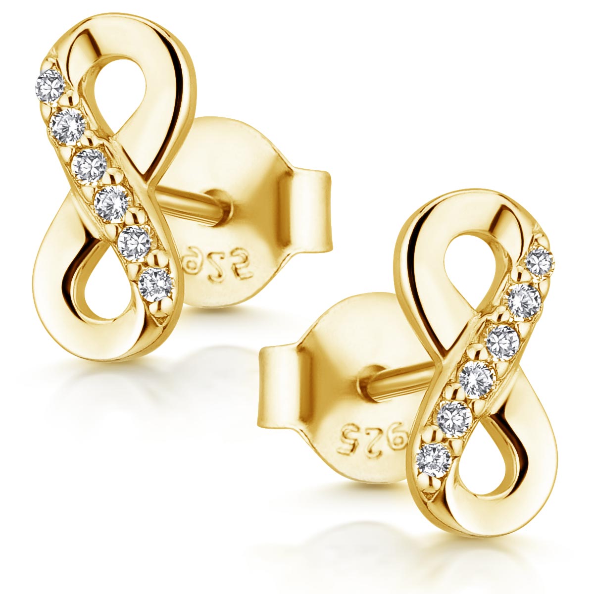 Zierliche Unendlichkeit Ohrstecker für Damen oder Jugendliche aus vergoldetem 925 Sterling Silber, besetzt mit weißen Zirkonia Steinen.