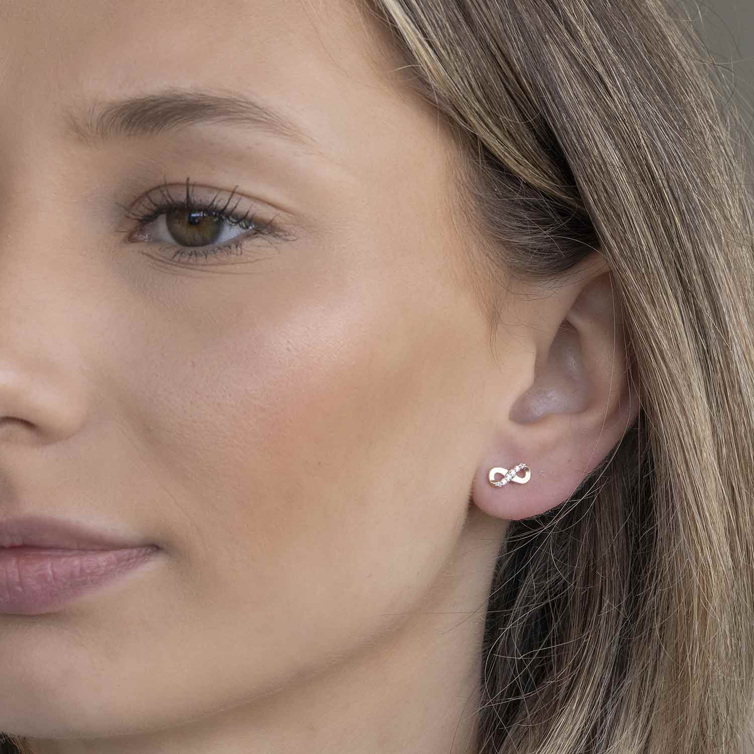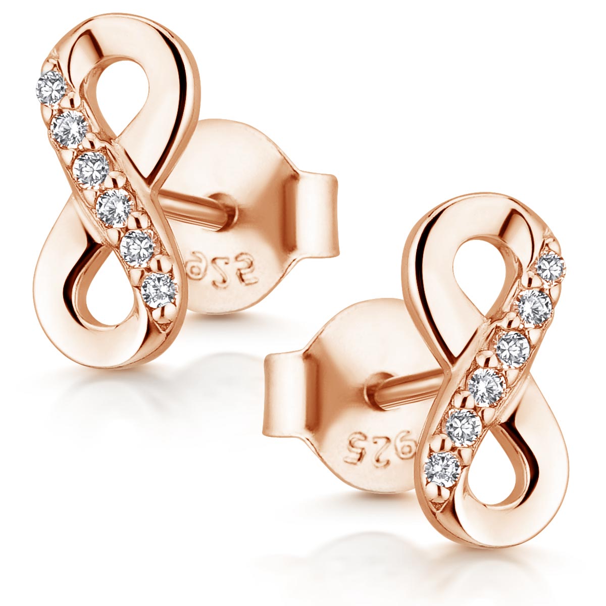 Zierliche Unendlichkeit Ohrstecker für Damen oder Jugendliche aus rosé vergoldetem 925 Sterling Silber, besetzt mit weißen Zirkonia Steinen.