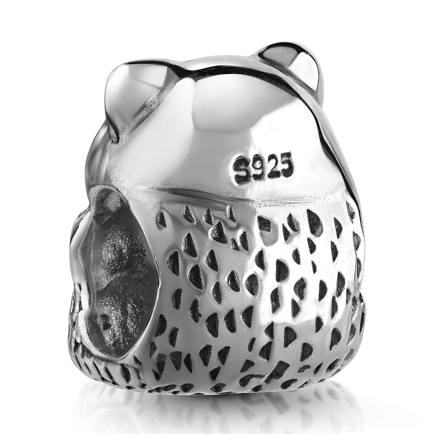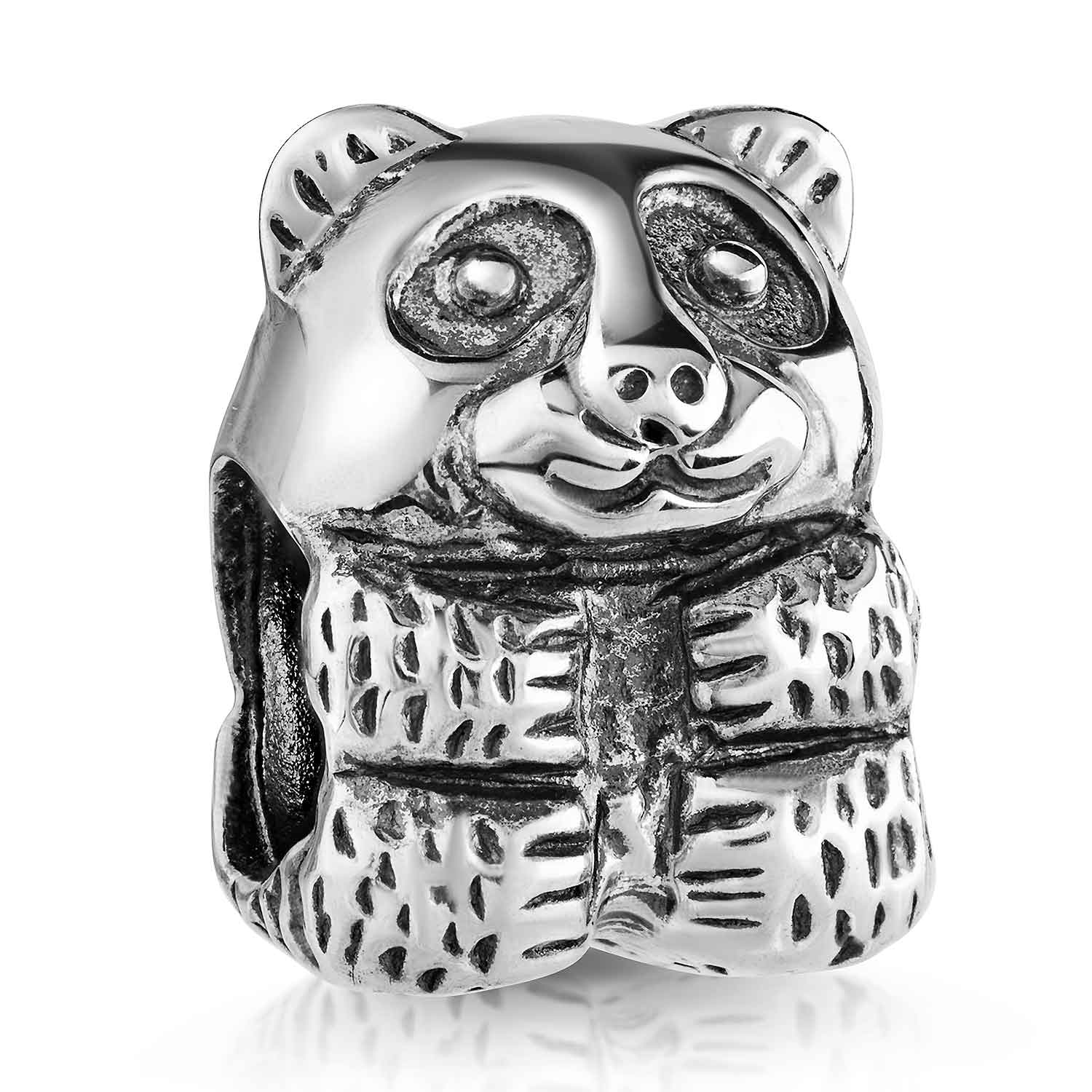 Silber Bead in Form eines Waschbär / Bär aus antik oxidiertem 925 Sterling Silber. Der Bead passt auf alle gängigen Beads Markenarmbänder und Ketten bis 4,4mm Stärke.