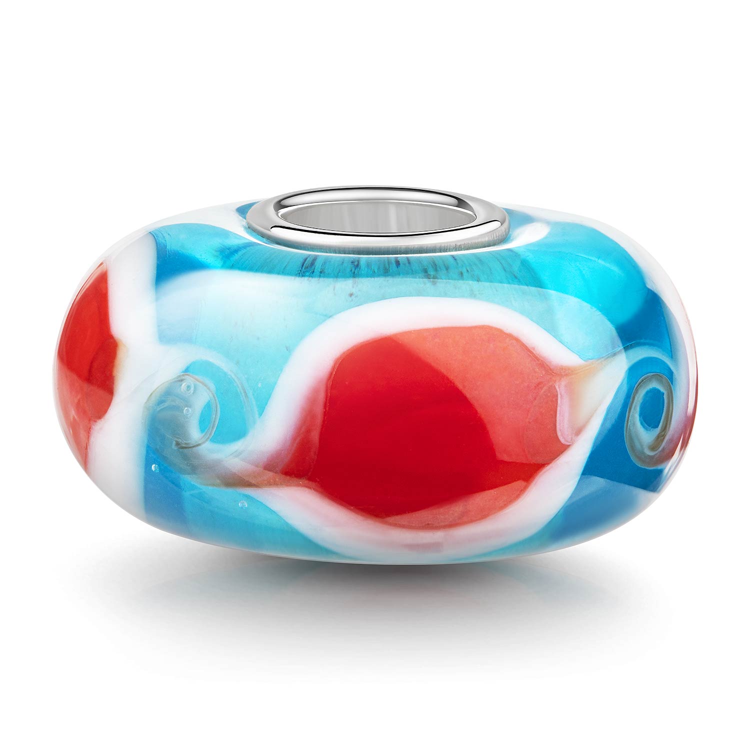 Edler hellblauer Glas Bead im Wellen-Design mit Wirbeln in Rot und Weiß. Die Hülse besteht aus 925 Sterling Silber und ist für Beads Armbänder und Ketten bis max 4,2mm Durchmesser geeignet.
