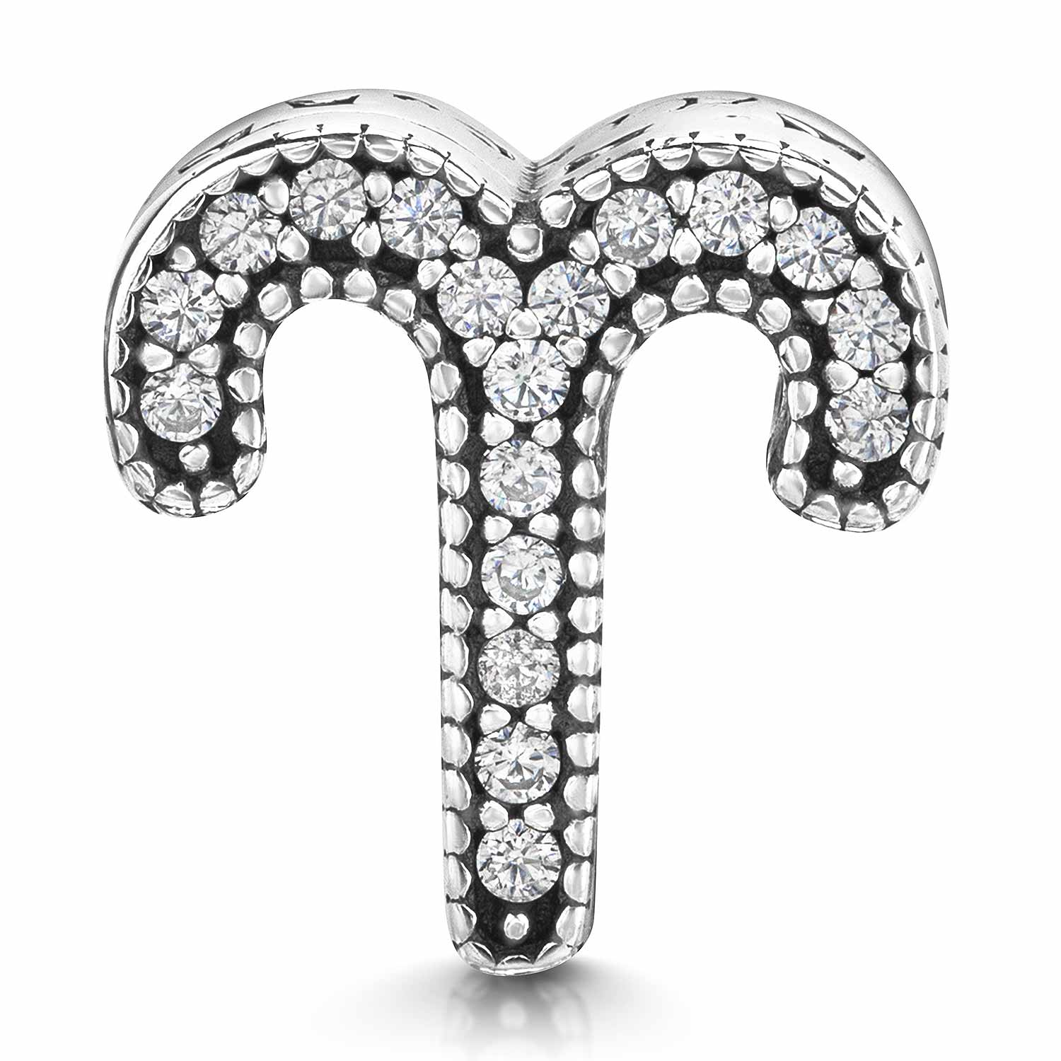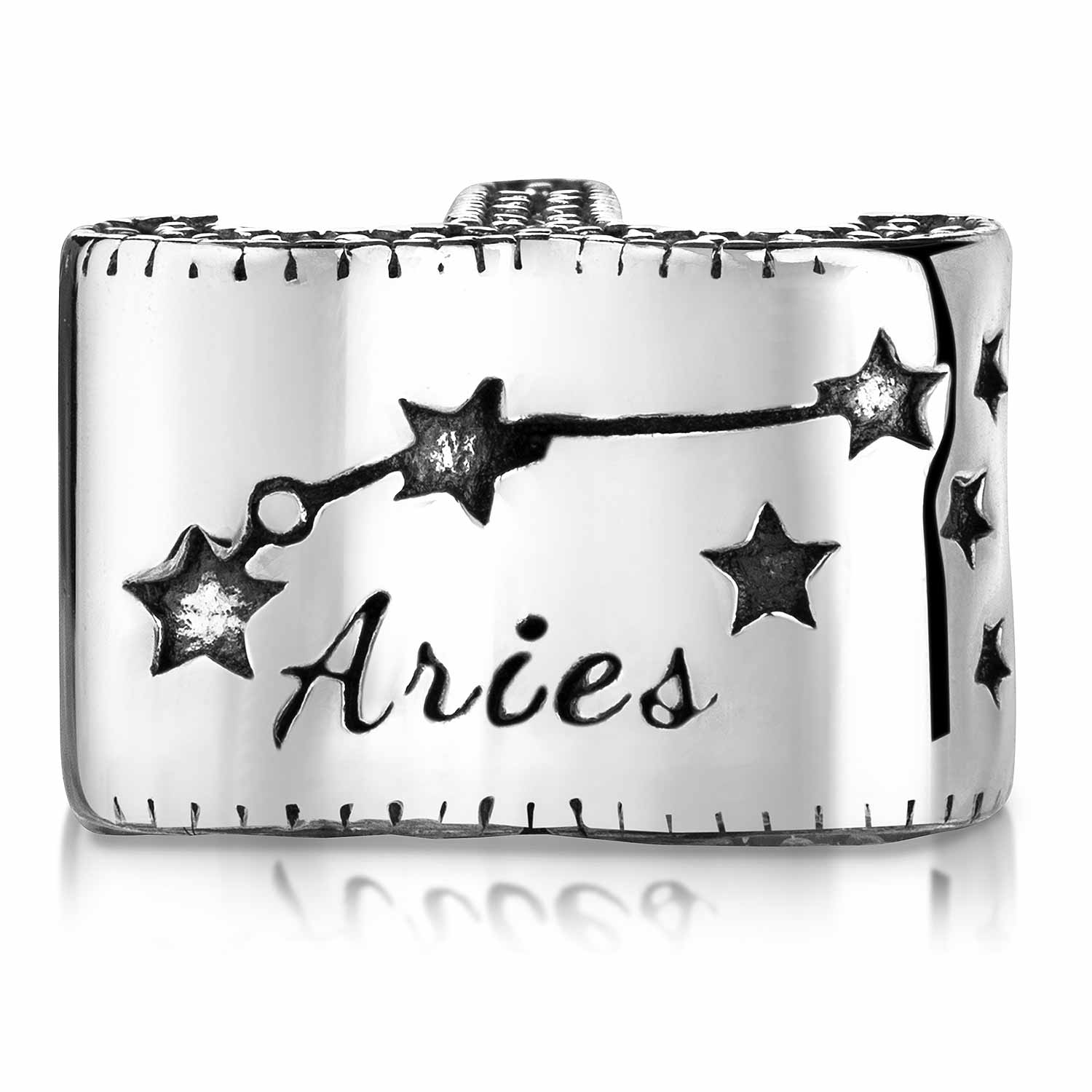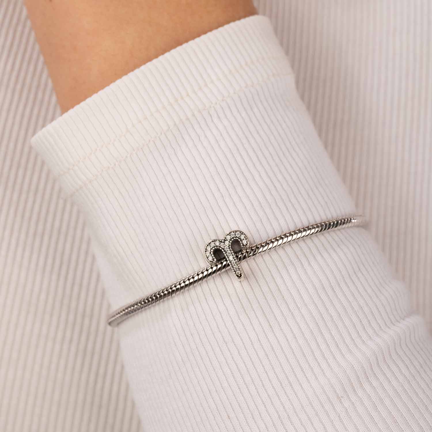 Funkelnder Charm mit dem Sternzeichen Widder aus 925 Sterling Silber. Der Bead ist mit zahlreichen weißen Zirkonia verziert und eignet sich für alle Beads Armbänder und Ketten bis 4,4mm Stärke.