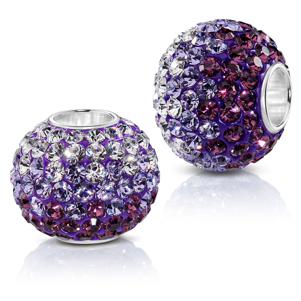 Edler Bead mit zahlreichen Kristallsteinen in Lila und Flieder und einer Hülse aus massivem 925 Sterling Silber. Der Schmuck Anhänger macht durch seine vielen funkelnden Steinchen einen besonders eleganten Eindruck.