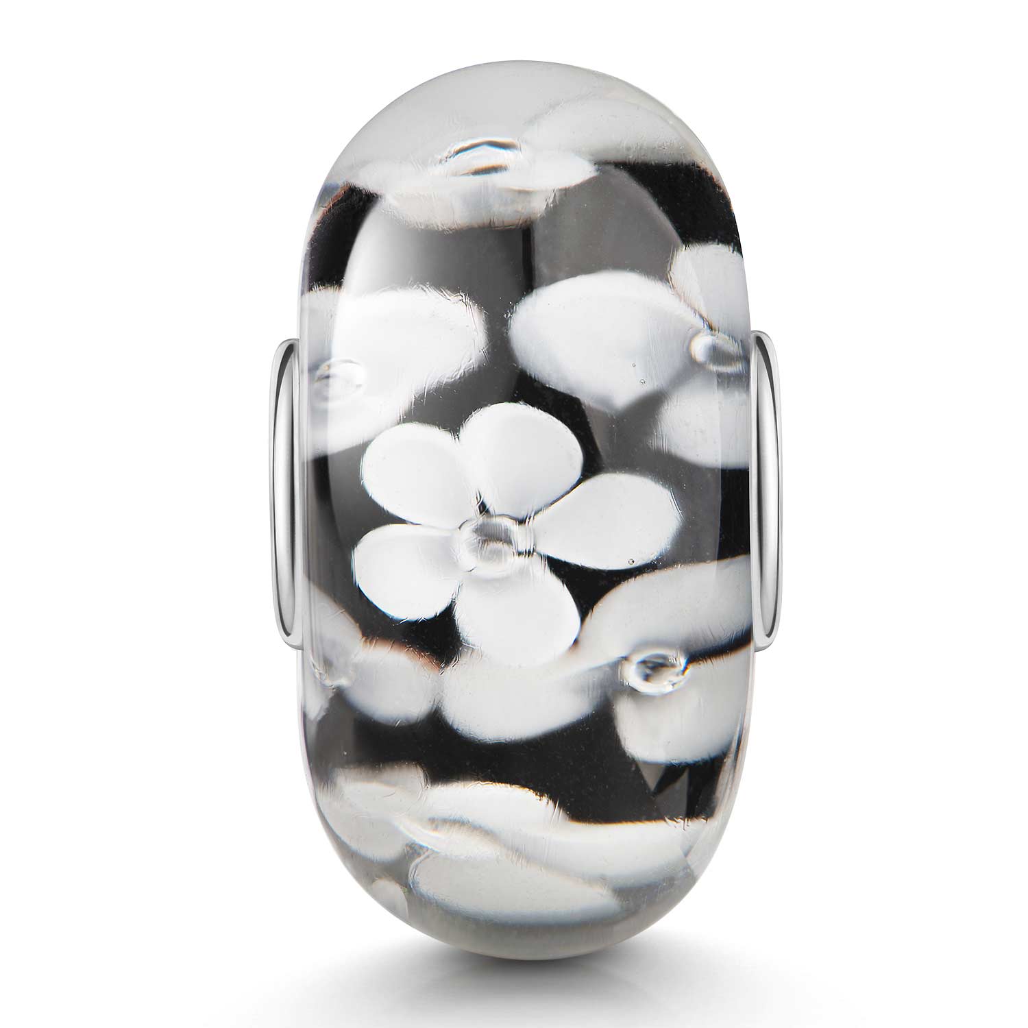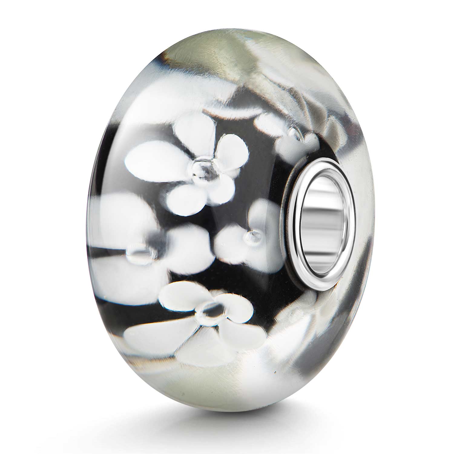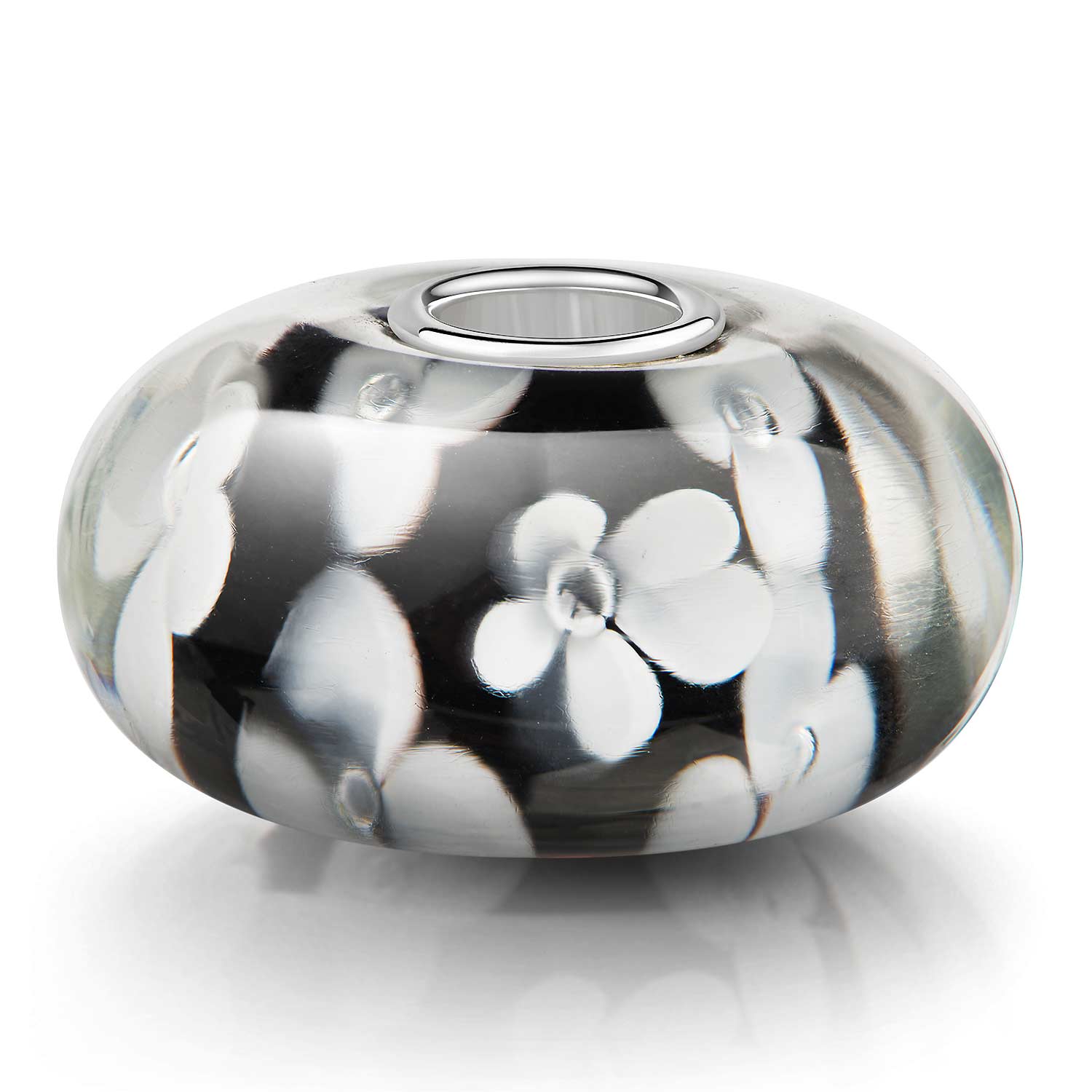 Oversized Glas Bead in Schwarz und Weiß mit vielen filigranen Margariten. Der Bead verfügt über eine Hülse aus 925 Silber und passt auf Ketten aller gängigen Marken bis 4,8mm Stärke.
