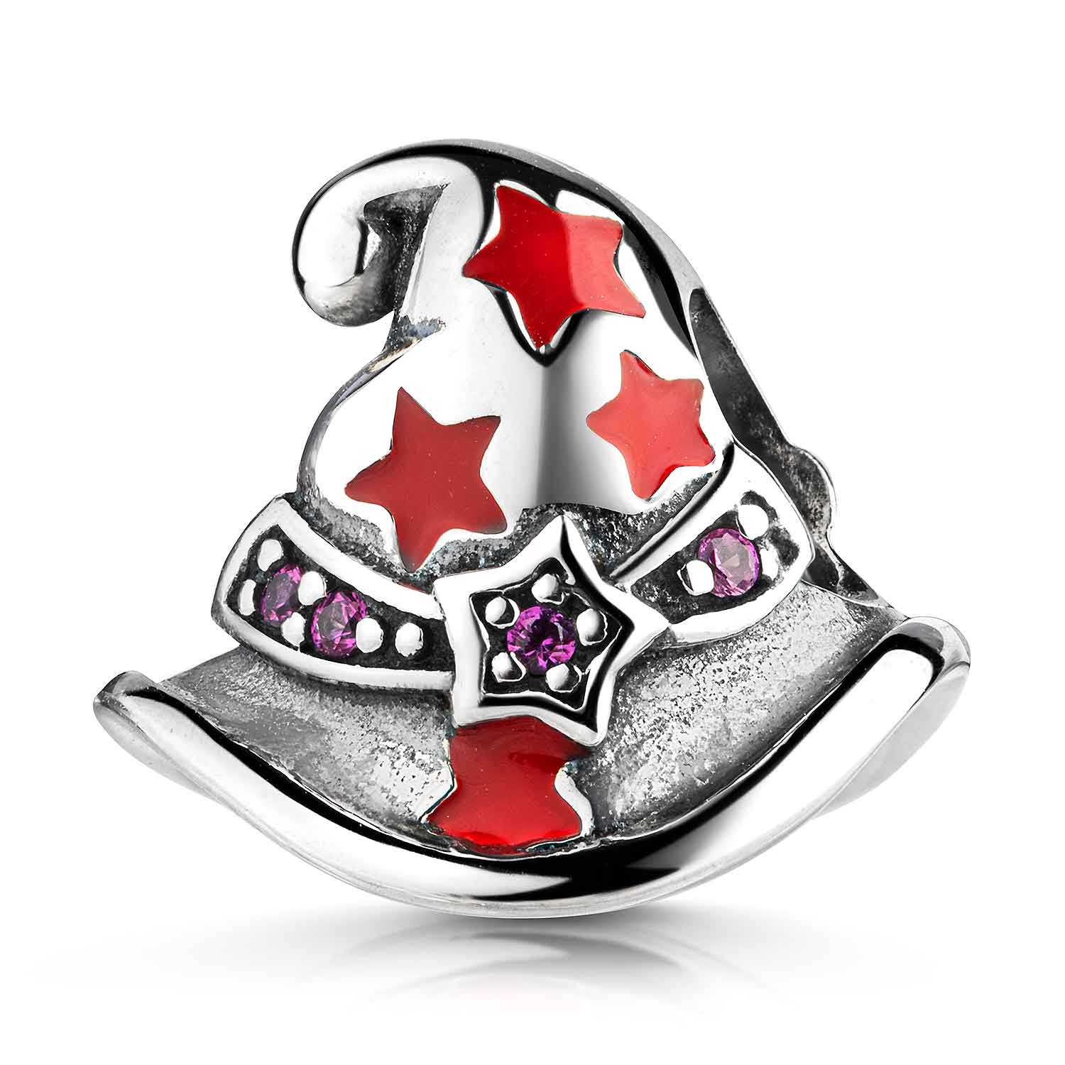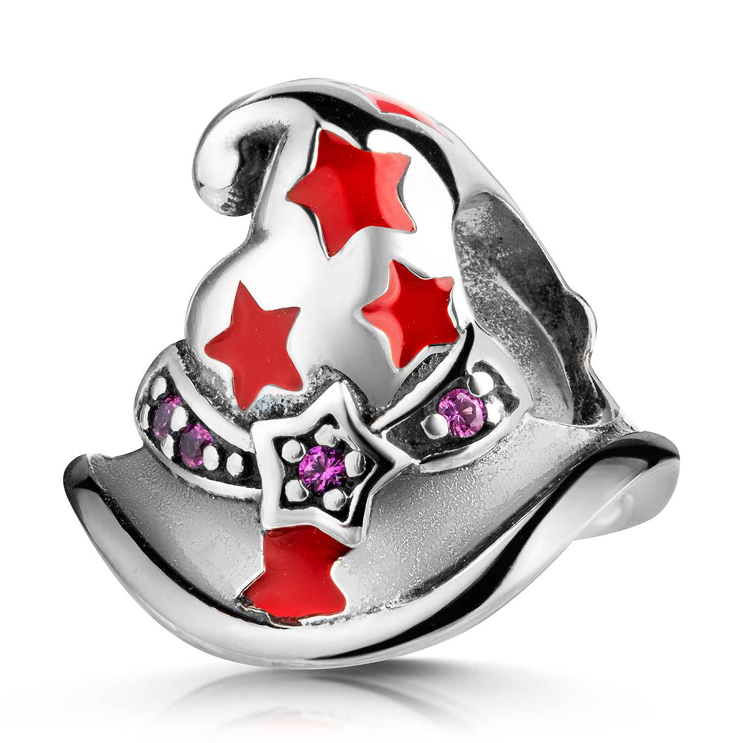 925 Silber Bead in Form eines Zauberhutes mit roten Sternen aus Emaille und pinken Zirkonia Steinen. Der Bead ist kompatibel zu allen Bead Armbändern & Ketten mit einer max. Stärke von 4,4mm.