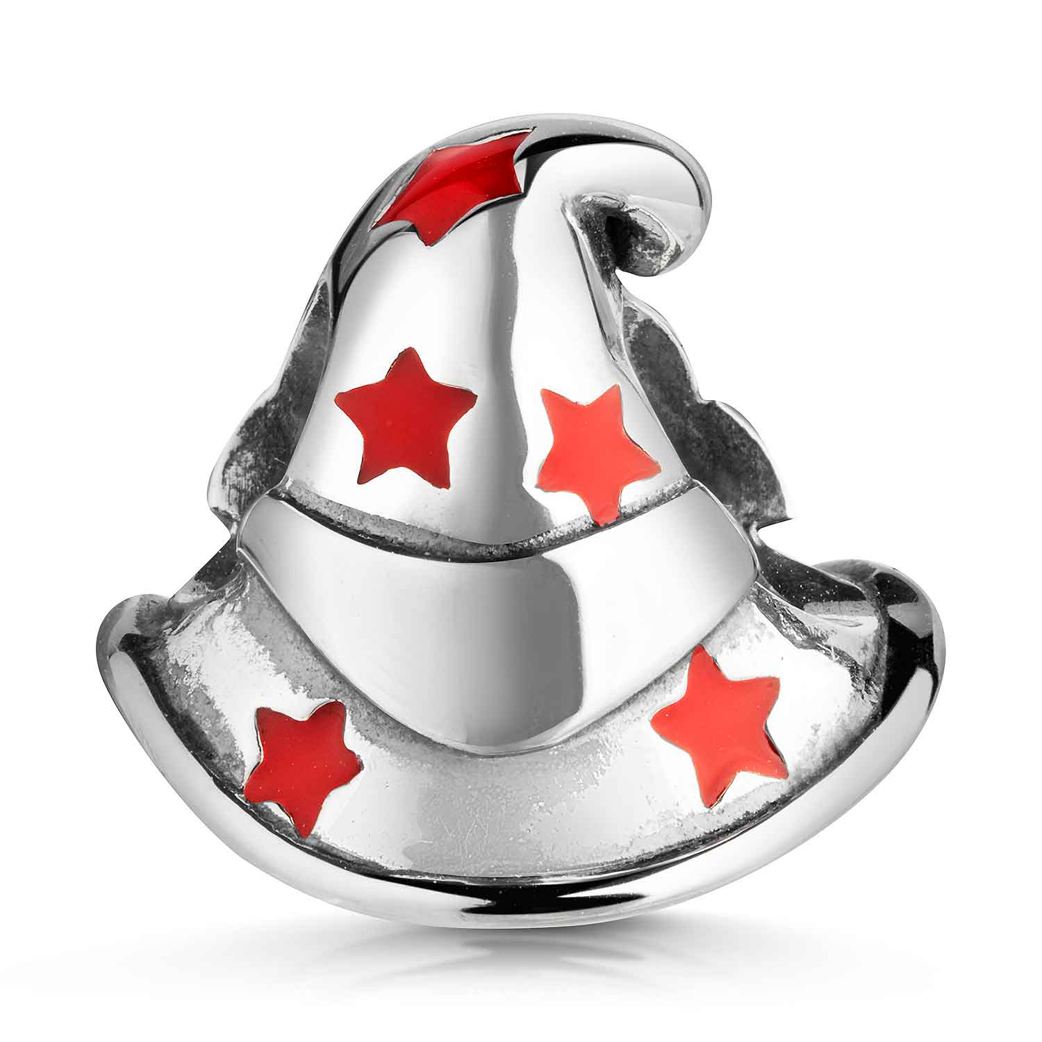 Bead in Form eines Zauberhutes aus 925 Sterling Silber. Der Bead ist mit roten Sternen aus Emaille und pinken Zirkonia Steinchen verziert. Der kleine Anhänger ist passend zu allen gängigen Bead Armbändern und Ketten bis max. 4,4mm Stärke.