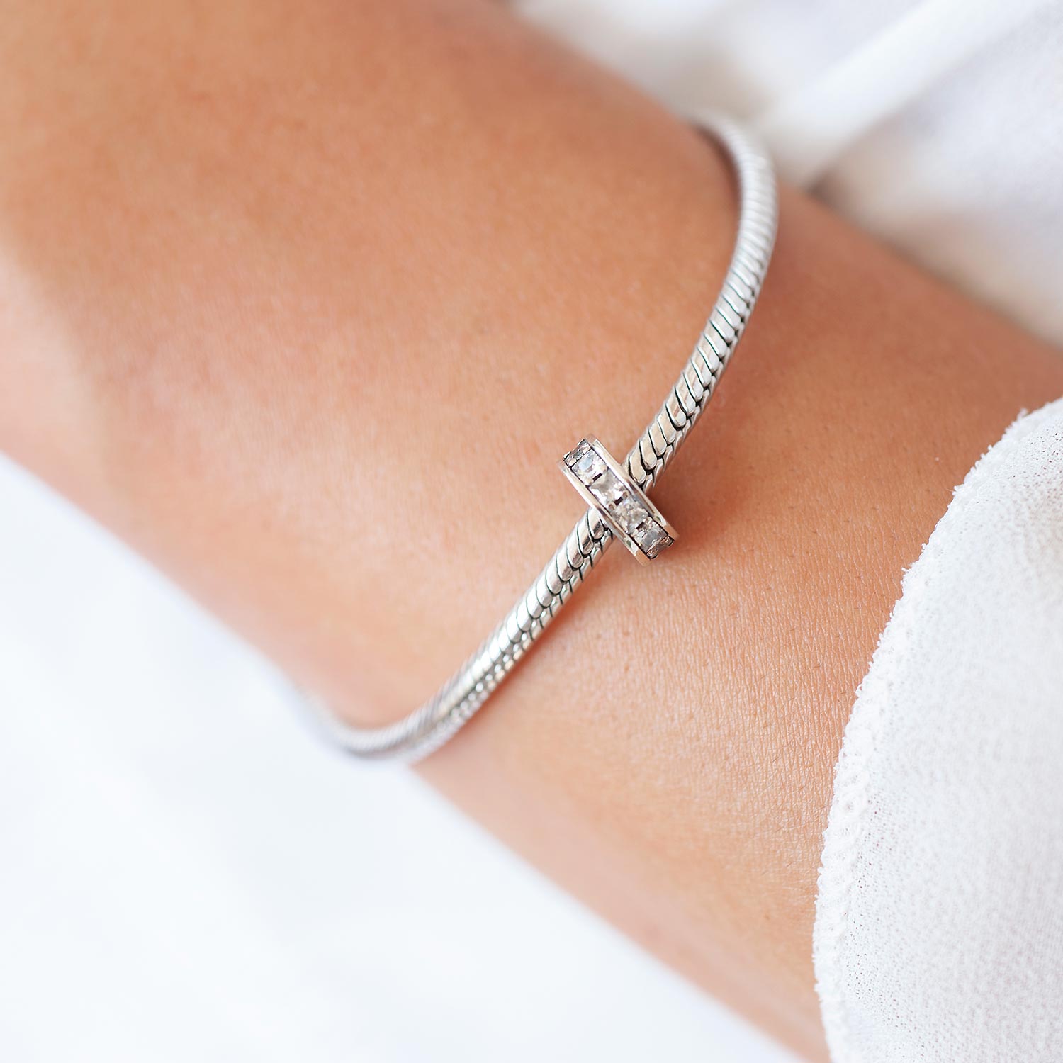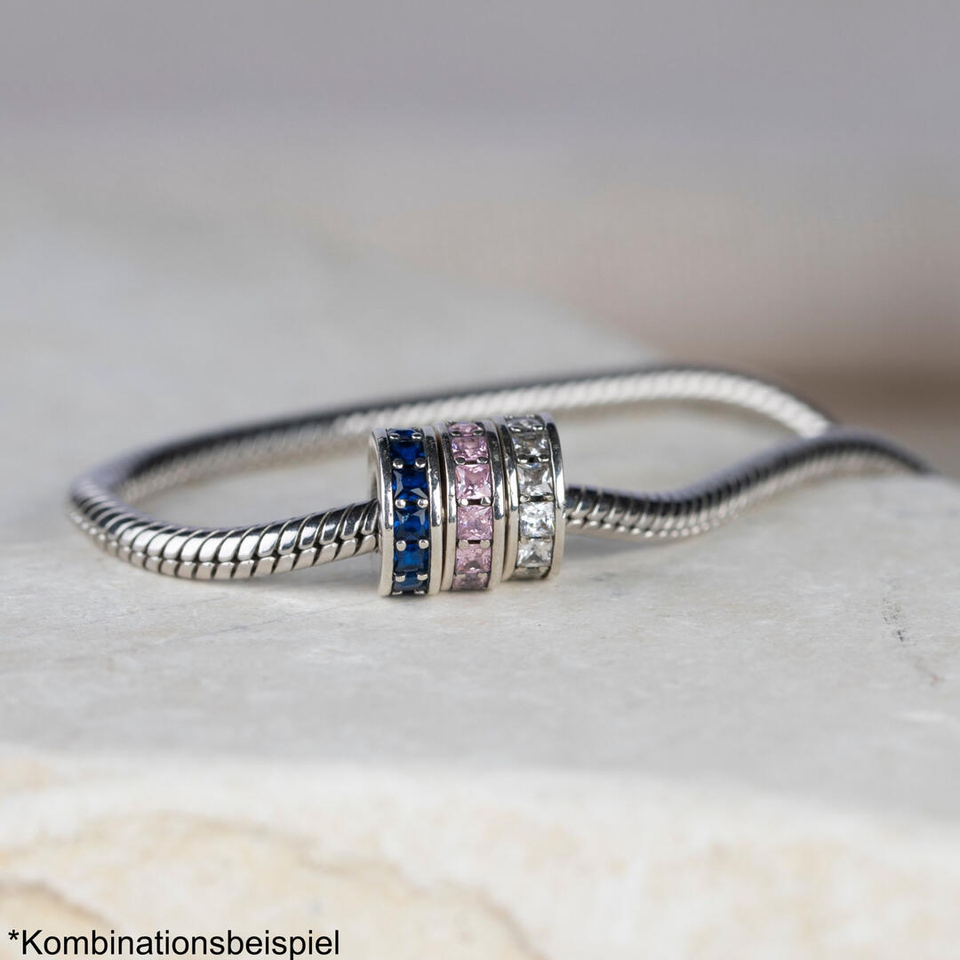Glitzernder Spacer Bead mit weißen Zirkonia Steinen aus 925 Sterling Silber. Das Zwischenelement passt zu allen gängigen Beads Armbändern bis max. 4,3mm Stärke.