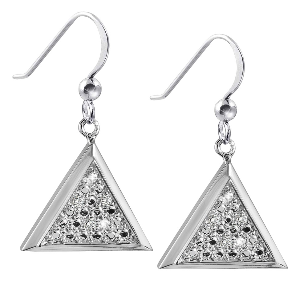 Unsere Schmuck Ohrhänger im Dreieck-Design wurden aus massivem 925 Sterling Silber gearbeitet. Die Ohrringe sind rhodiniert und damit dauerhaft anlaufgeschützt. Jeder Ohrring ist mit je einem weißen Zirkonia im Prinzess-Schliff besetzt. Die kleinen Hänger bestechen durch feine saubere Verarbeitung und schlichte Schönheit.