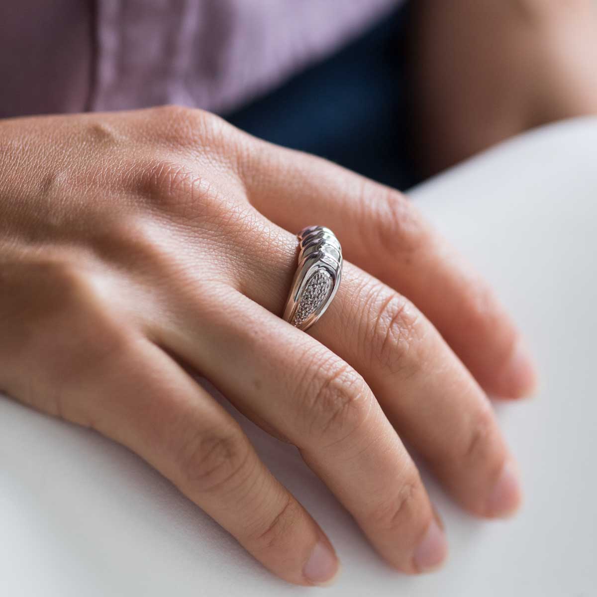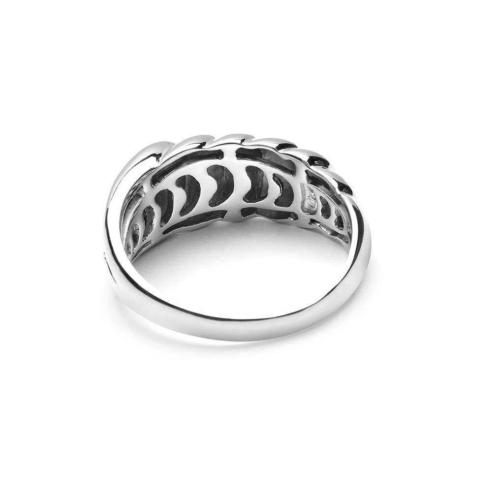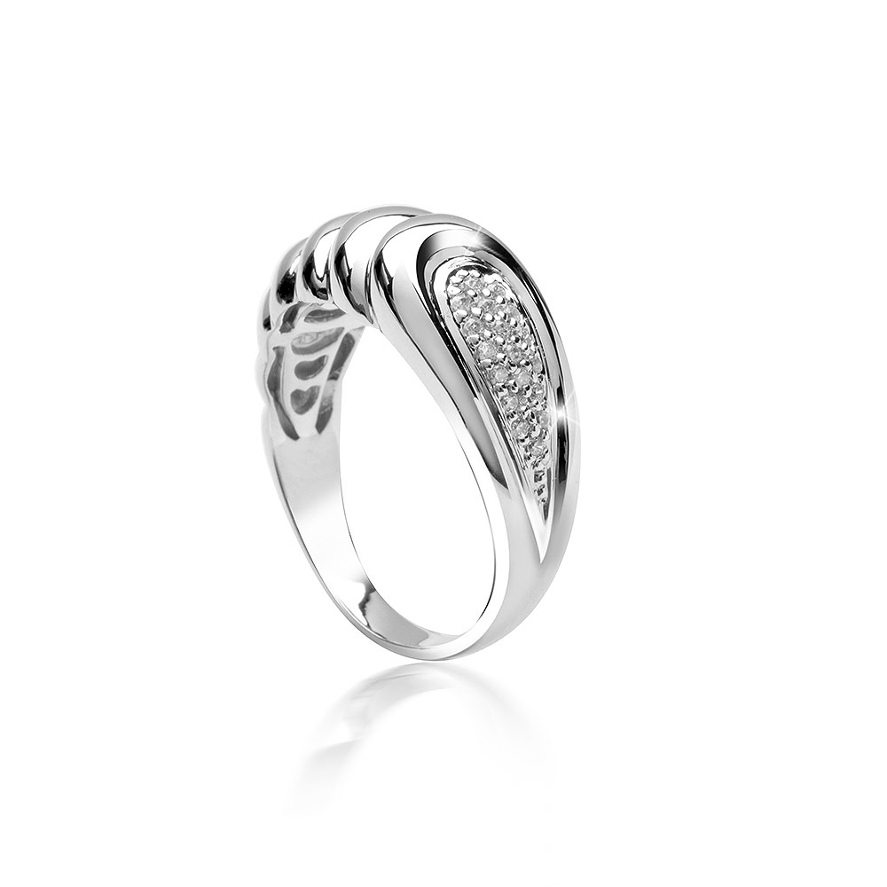 Unser Damen Ring hat eine ungleichmässige Form die ihm eine einzigartige Optik verleiht. Er ist in einer en Silberschmiede aus rhodiniertem 925 Sterling Silber gefertigt und mit 13 weißen Zirkonia Steinen geschmückt. Seine Besonderheit besteht darin, dass er auf der Unterseite flach verbödet ist, so lässt sich der Finger leichter eingleiten und das Schmuckstück fühlt sich besonders anschmiegsam an. Die Lieferung erfolgt in einer Materia Schmuckbox und eignet sich somit bestens als Geschenk.